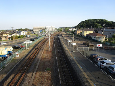 駅のすぐ南にある歩道橋から水戸方面を見たところです。呉羽化学工場への専用線があった頃の側線の一部が残っています。