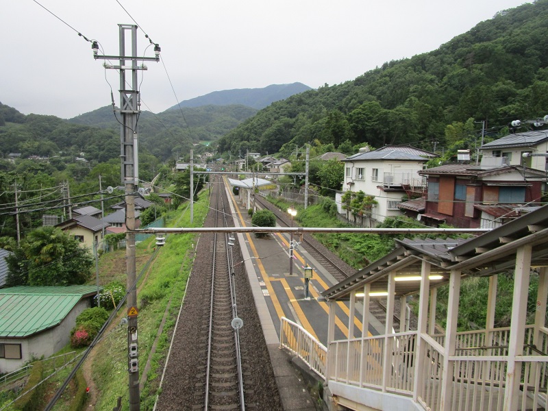駅のすぐ南側を走る国道20号線甲州街道沿いに民家が並んでいますが、そのすぐ先は桂川の谷になっています。